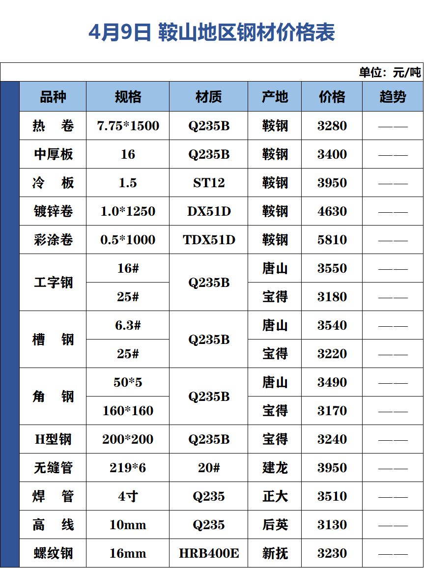 4月9日 鞍山地區(qū)鋼材價格表